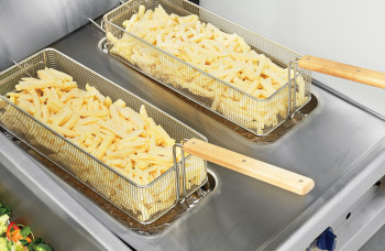 Каждая ванна позволяет заливать до 16,5 кг масла, а максимальная загрузка продуктов в корзины составляет 3,6 кг (по 1,8 кг в каждую корзину). В комплект входят две корзины размером 507х190х105 мм, что делает процесс жарки удобным и эффективным.