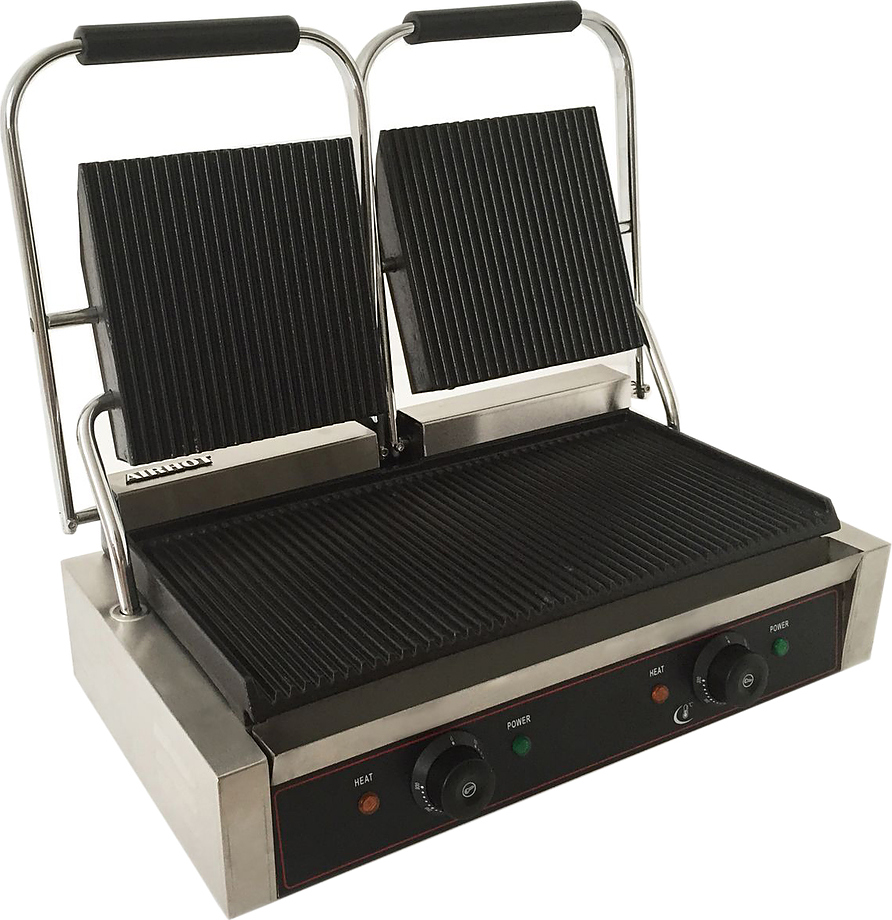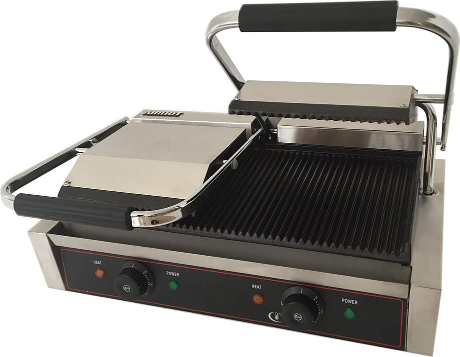 Электрический прижимной гриль Airhot DCG с рифлеными рабочими поверхностями предназначен для жарки различных продуктов, таких как мясо, рыба, морепродукты, овощи, и идеально подходит для ресторанов и кафе. Он отлично справляется с приготовлением шаурмы, бургеров, стейков и горячих сэндвичей.
