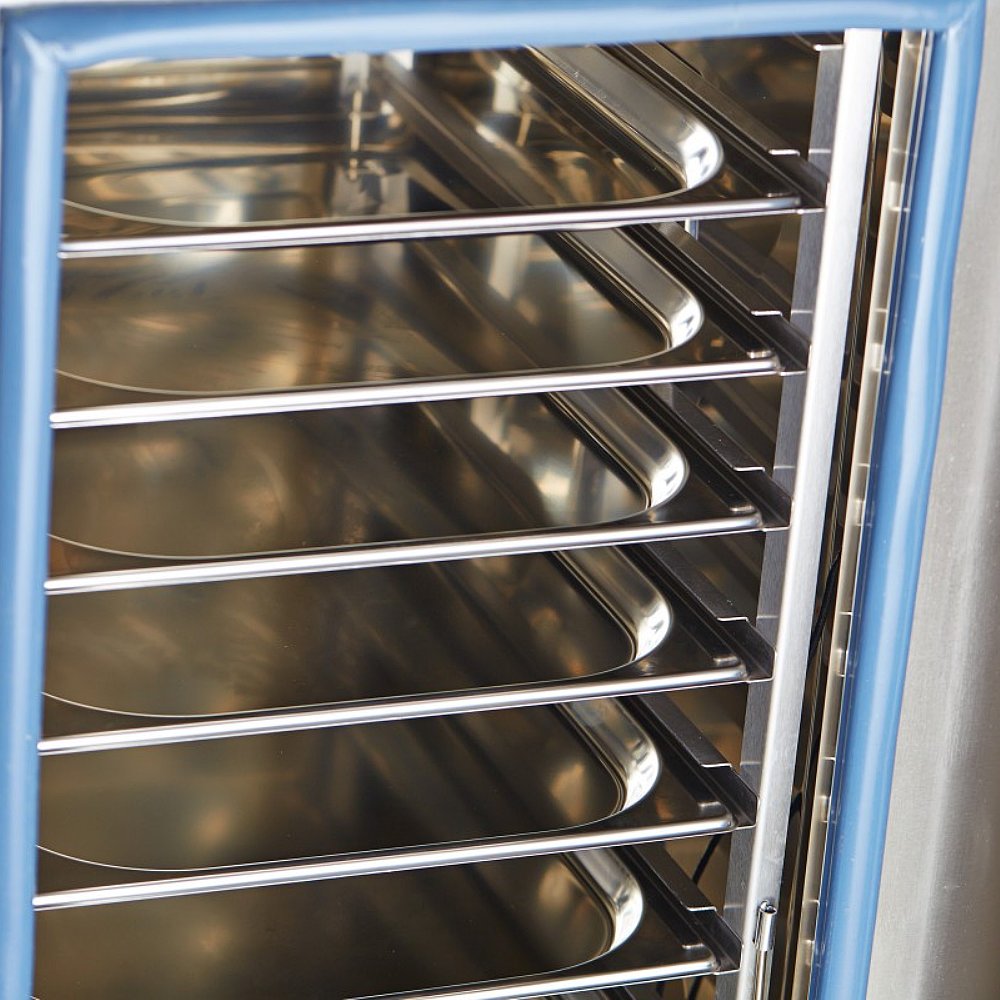 Пароконвектомат легко чистится благодаря встроенной системе охлаждения слива и полуавтоматической мойке с использованием режима "ПАР". Внутренние поверхности можно мыть под струей воды, что упрощает уход за оборудованием.