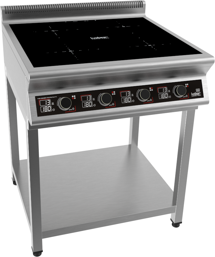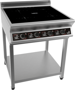 Плита индукционная на открытой подставке, 4 конфорки мощностью 4х3,5кВт, электронная панель управления с цифровой индикацией, 13 уровней нагрева, таймер до 180мин., съемный жировой фильтр, корпус из н.с. AISI 304, регулируемые по высоте ножки, рабочая поверхность - стеклокерамика 6мм, 14 кВт, 380В, вес 61 кг.