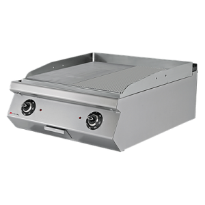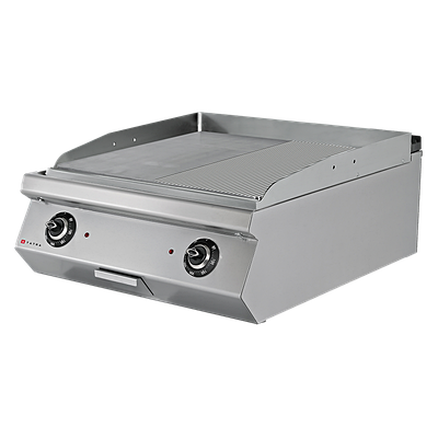 Модель оснащена комбинированной жарочной поверхностью (1/2 гладкая+1/2 рифленая) толщиной 20 мм, с двумя зонами нагрева с независимой регулировкой, общим размером 789х495 мм.