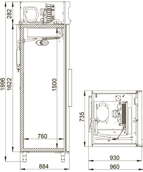 Внутреннее пространство освещается светодиодной подсветкой, а автоматическая система оттайки с испарением конденсата упрощает уход за устройством. Шкаф также оснащен электронным блоком управления и микропереключателем, что обеспечивает удобство в использовании. Замок на двери добавляет уровень безопасности.