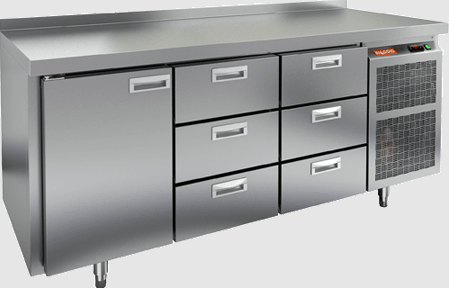 Столешница выполнена из нержавеющей стали, что гарантирует долговечность и легкость в уходе. Толщина теплоизоляции составляет 50 мм, что способствует эффективному сохранению температуры. Охлаждение осуществляется динамическим способом, а автоматическая оттайка упрощает обслуживание.