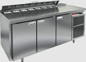 Объем устройства составляет 505 литров, что делает его вместительным и практичным для использования в условиях высокой загрузки. Холодильный агрегат расположен справа, а конструкция соответствует гастронормам, что упрощает организацию пространства. Стол выполнен из нержавеющей стали, что гарантирует долговечность и легкость в уходе.