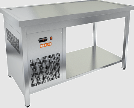 Холодильный агрегат расположен с левой стороны, что позволяет эффективно использовать пространство. Устройство не имеет гастронормированных размеров и борта, что делает его еще более удобным в эксплуатации. Стол выполнен из нержавеющей стали, что гарантирует долговечность и легкость в уходе. Толщина столешницы составляет 50 мм, что обеспечивает дополнительную прочность.