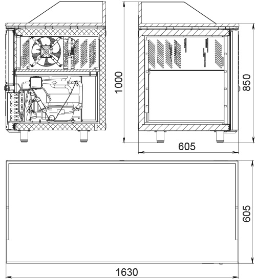 - Габариты: ширина 1630 мм, глубина 705 мм, высота 1000 мм