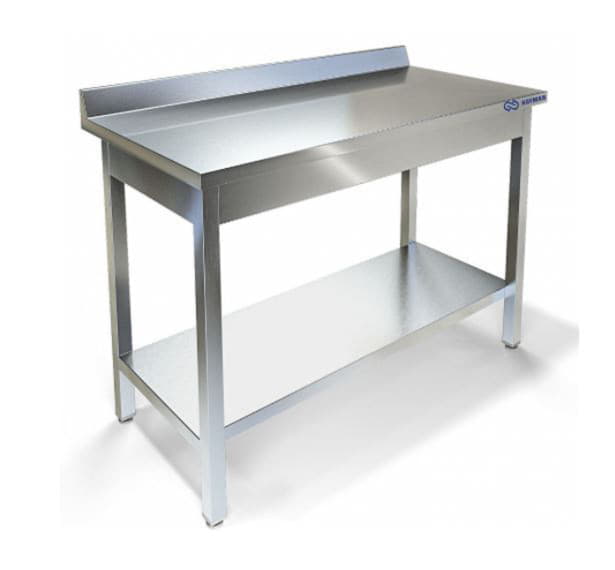 Стол на каркасе из уголка AISI430, столешница из AISI430 с бортом. Внизу сплошная полка-накладка из AISI430.