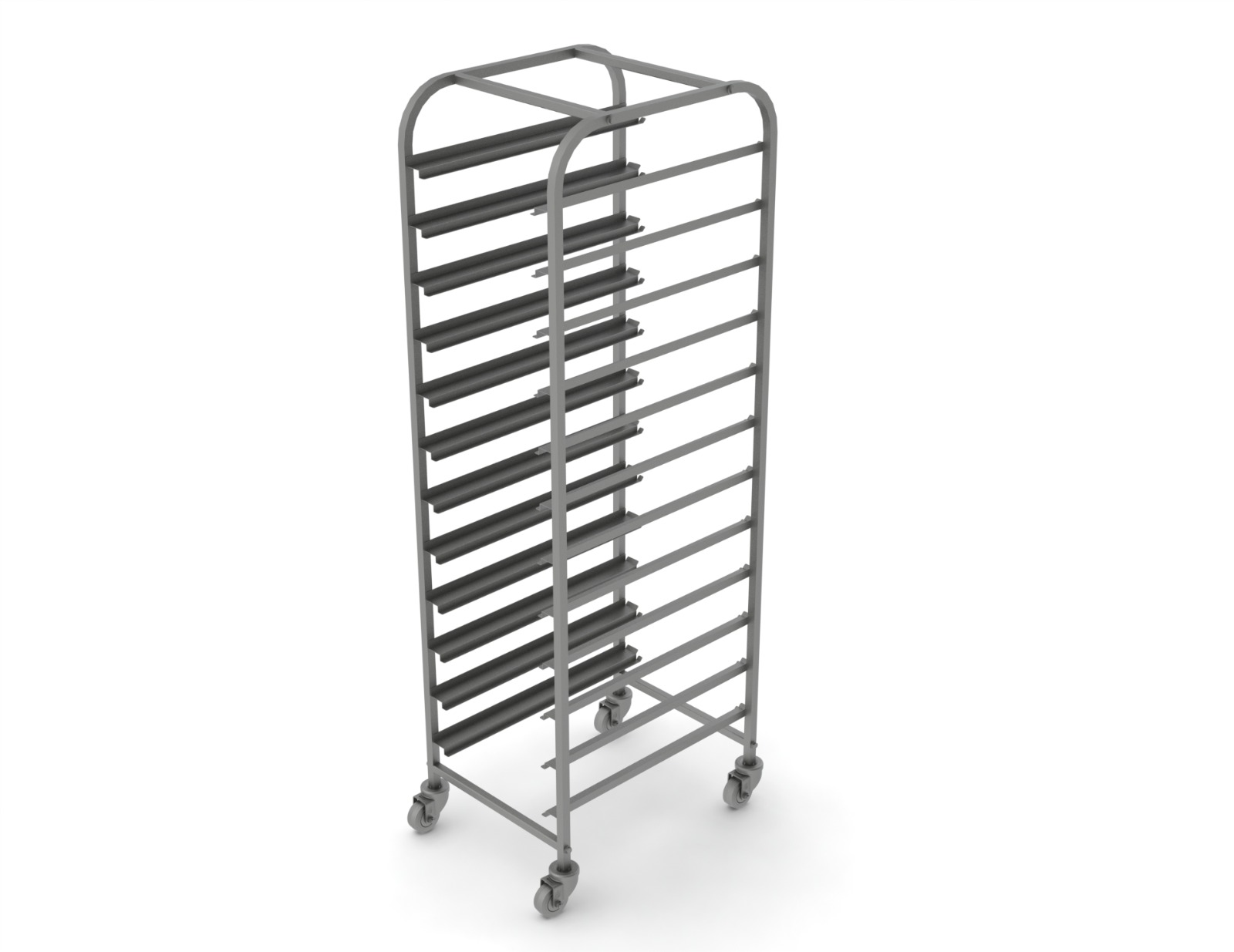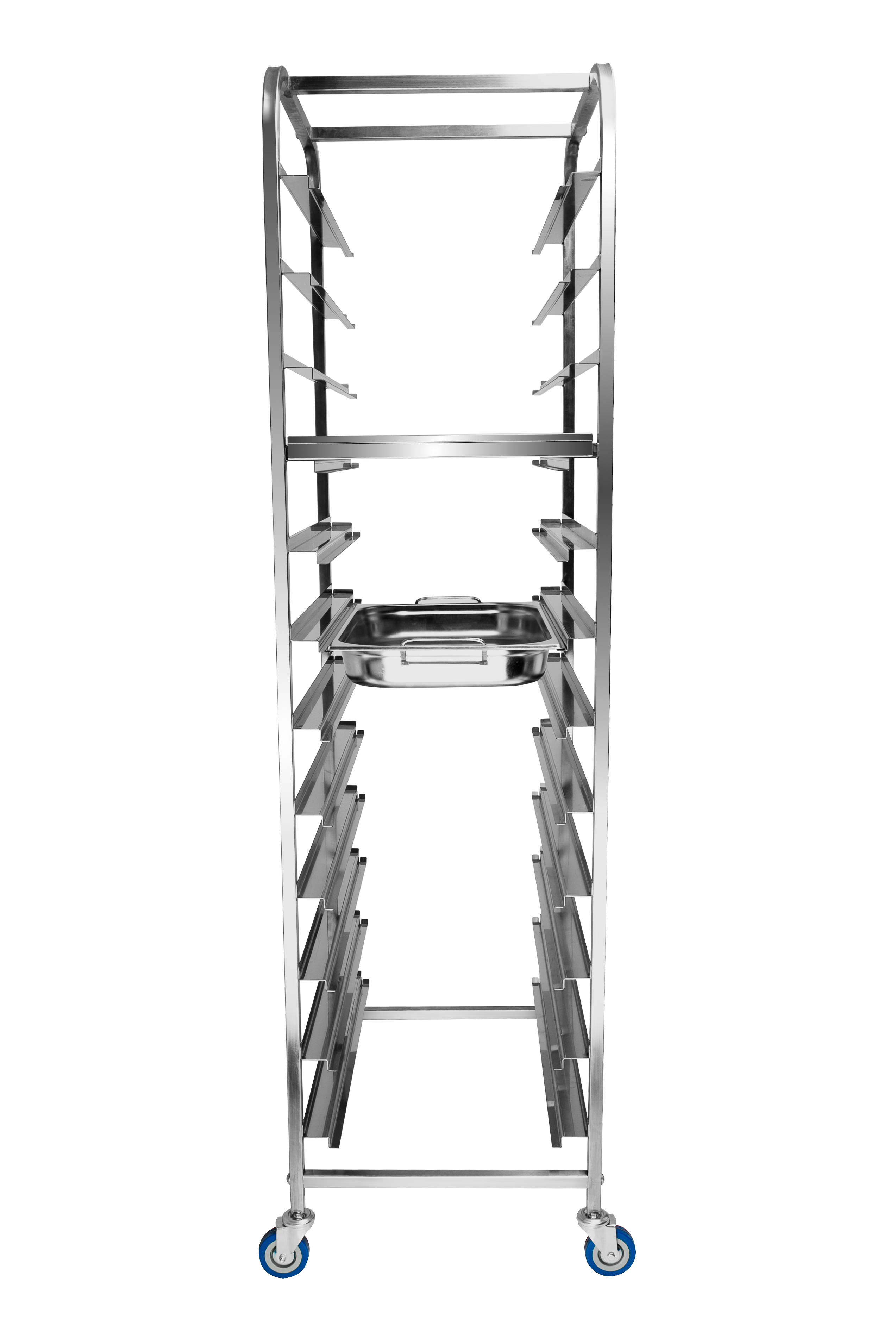 Тележка имеет 12 рядов направляющих для гастроемкостей с расстоянием между ними в 120 мм, что обеспечивает удобство загрузки по узкой стороне. Конструкция выполнена из высококачественной пищевой нержавеющей стали AISI 430 и состоит из двух стоек с приваренными направляющими и четырьмя перекладинами. Стойки изготовлены из квадратных труб.