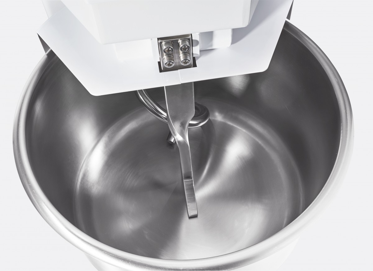 Корпус тестомеса выполнен из прочной конструкционной стали с полимерным покрытием, а детали, контактирующие с тестом, изготовлены из нержавеющей стали AISI 304, что обеспечивает долговечность и легкость в уходе.