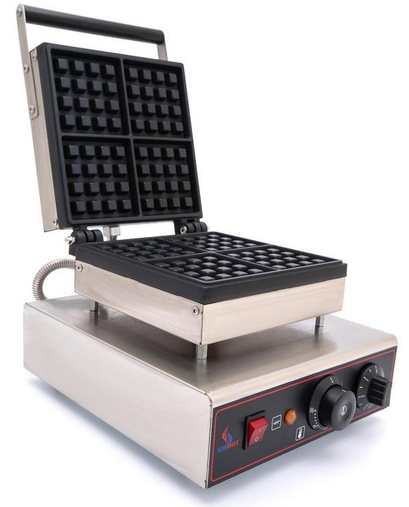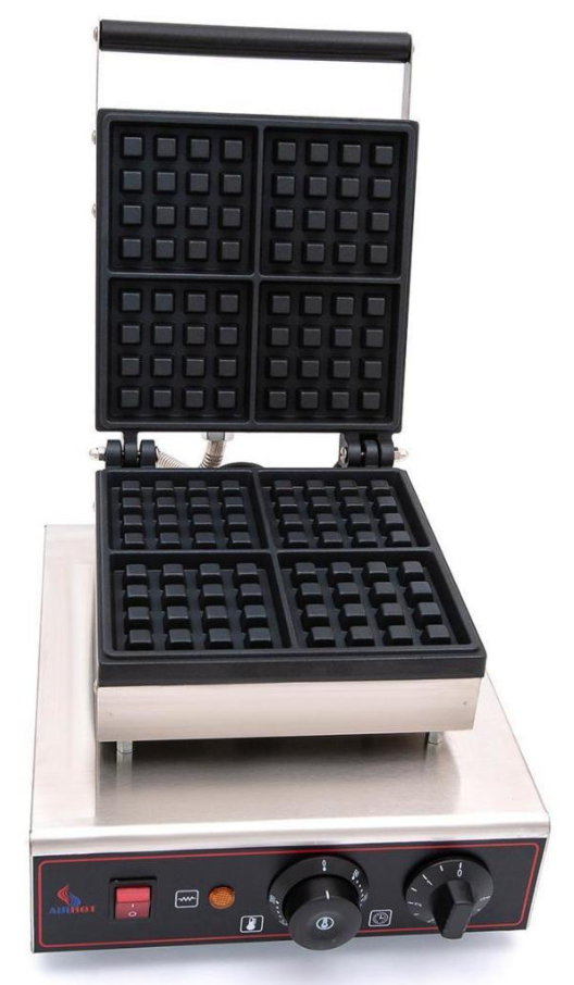 Устройство имеет возможность одновременно выпекать 4 вафли толщиной 12 мм, что значительно ускоряет процесс обслуживания клиентов. Рабочая поверхность выполнена из алюминия с антипригарным покрытием, что гарантирует легкость в уходе и предотвращает прилипание теста. Размеры вафельницы составляют: